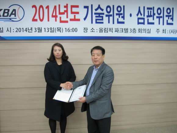 대한야구협회 박상희 부회장으로부터 심판 위촉장을 받고 있는 김민서 씨.