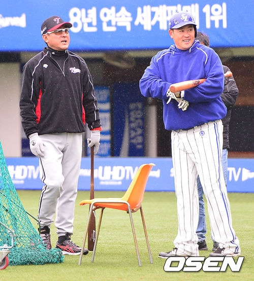 LG 김기태 감독과 삼성 진갑용이 훈련 중 인사를 나누고 있다.