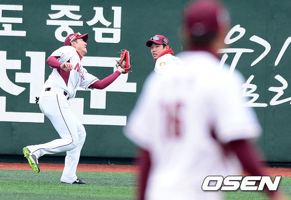 1회초 무사에서 넥센 유한준이 SK 김강민의 중견수 플라이 타구를 잡아내고 있다.