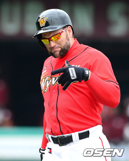 4회초 2사에서 SK 스캇이 파울을 날리고 손을 흔들며 괴로운 표정을 짓고 있다.