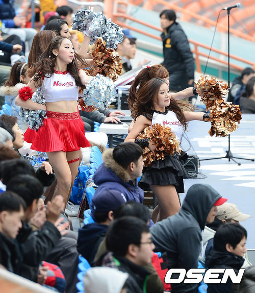 넥센 치어리더가 쌀쌀한 날씨에도 불구하고 열띤 응원을 선보이고 있다.