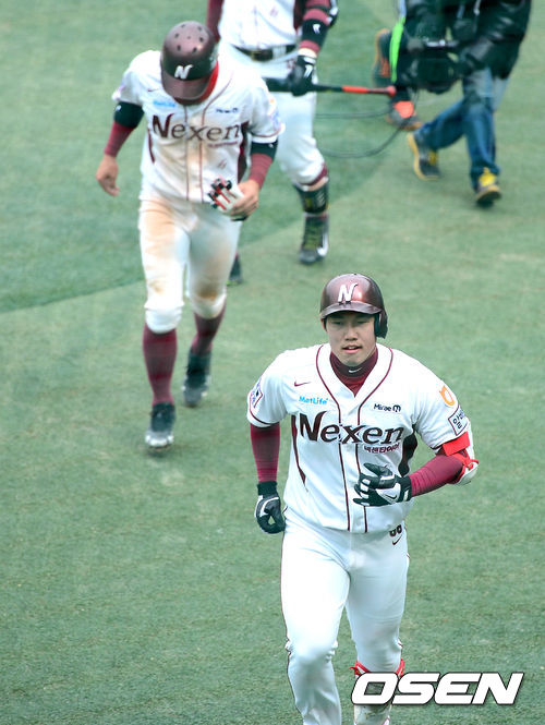 4회말 2사 2루에서 넥센 강지광이 투런포를 날리고 홈을 밟으며 동료선수들과 하이파이브를 하고 있다. 강지광은 1회말 공격에서도 솔로포를 날렸다.