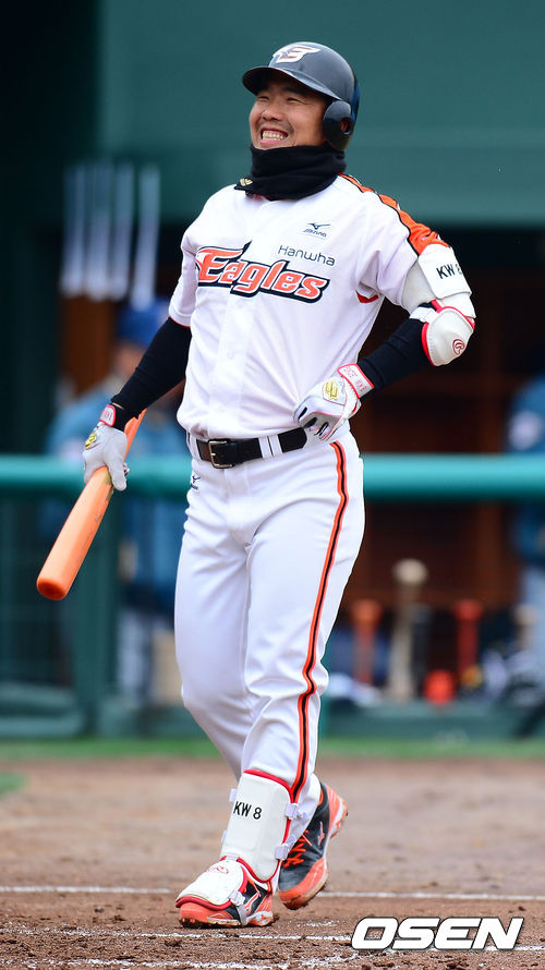 3회말 무사 한화 정근우가 헛스윙을 한 뒤 멋쩍은 미소를 짓고 있다.