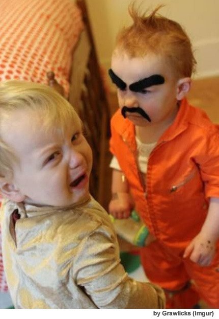 최근 임그르(imgur)라는 사진 공유 SNS에는 두 아이의 모습을 담은 사진 한 장이 올라왔다. 이 사진에는 두 아이가 등장는데 한 아이가 얼굴에 두꺼운 눈썹과 긴 콧수염을 붙였고, 다른 아이는 금방이라도 눈물을 쏟아낼듯 울상이다.