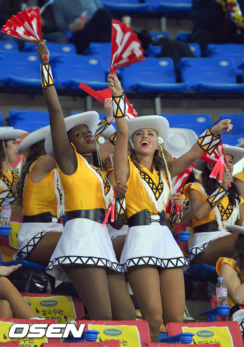 13일 오후 서울 잠실학생체육관서 열린 2013-14 KB국민카드 프로농구 플레이오프 1차전 서울 SK와 고양 오리온스의 경기전 美 타일러 주니어 대학팀이 멋진 응원을 펼치고 있다.