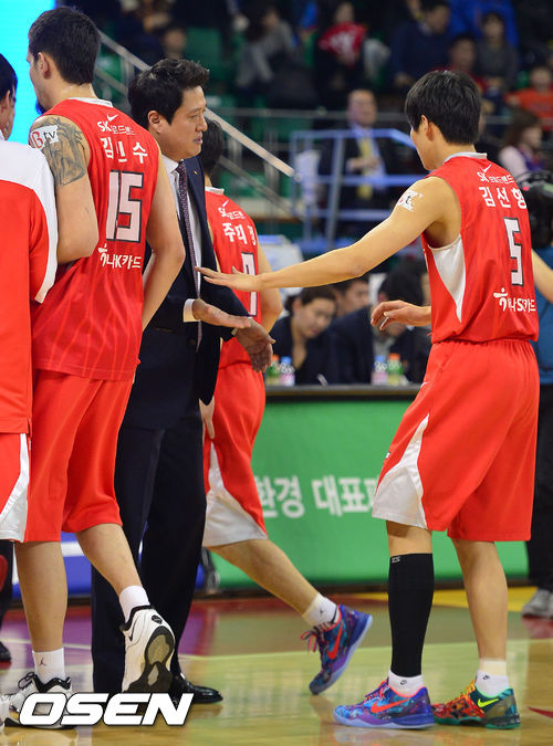 13일 오후 서울 잠실학생체육관서 열린 2013-14 KB국민카드 프로농구 플레이오프 1차전 서울 SK와 고양 오리온스의 경기, 2쿼터 SK 문경은 감독이 점수차가 벌이지자 선수들을 격려하고 있다.