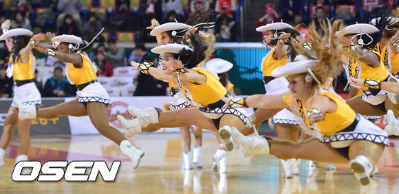 13일 오후 서울 잠실학생체육관서 열린 2013-14 KB국민카드 프로농구 플레이오프 1차전 서울 SK와 고양 오리온스의 경기 하프타임때 美 타일러 주니어 대학팀이 멋진 응원을 펼치고 있다.