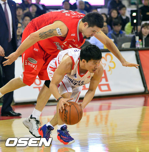 13일 오후 서울 잠실학생체육관서 열린 2013-14 KB국민카드 프로농구 플레이오프 1차전 서울 SK와 고양 오리온스의 경기 3쿼터 오리온스 이현민과 SK 김민수가 루즈볼을 다투고 있다.