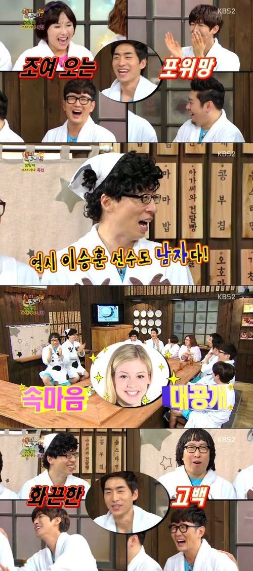 이에 MC들이 격한 반응을 보이자 이승훈은 "소치에서 그 선수의 경기를 봤는데, 눈에 띄더라. 경기를 잘 했으면 좋겠다고 생각했다"며 수줍은 듯 웃어보였다.
