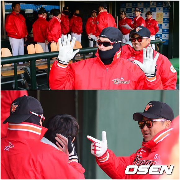 경기에 앞서 SK 스캇과 조인성이 더그아웃에서 장난을 치고 있다.