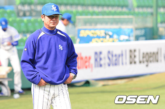 14일 오전 대구구장에서 열리는 '2014 프로야구 시범경기' 삼성 라이온즈와 LG 트윈스의 경기를 앞두고 삼성 류중일 감독이 선수들의 훈련을 지켜보고 있다.