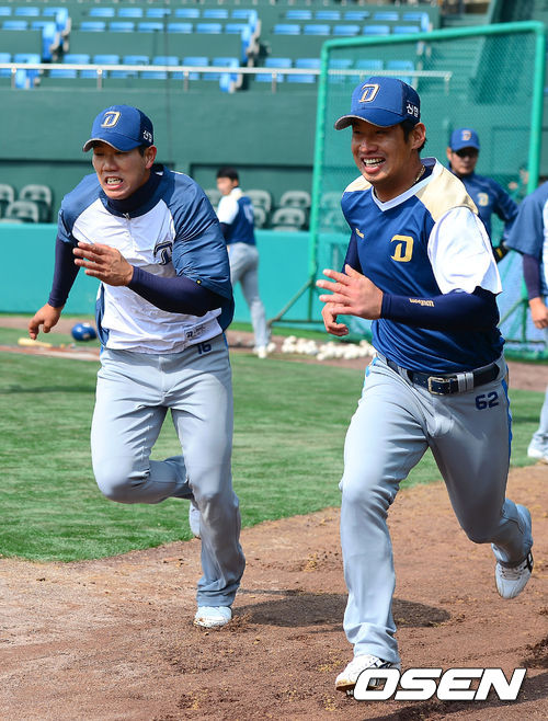 경기에 앞서 NC 모창민과 박정훈이 달리기 시합을 하고 있다.