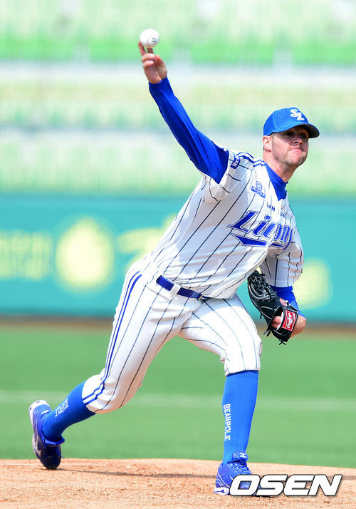 삼성 선발 밴덴헐크가 힘차게 공을 뿌리고 있다.