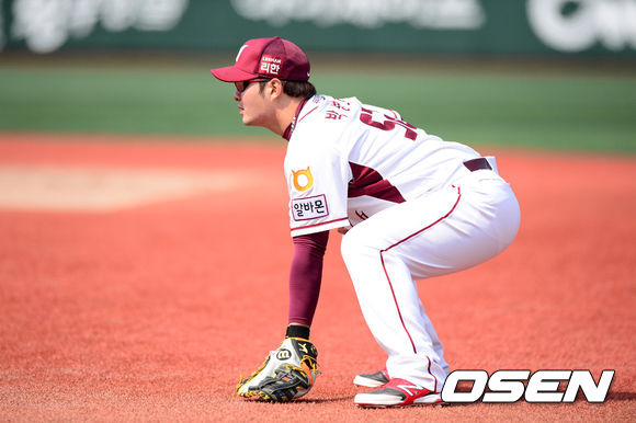 1회초 넥센 박병호가 4번 1루수로 선발 출장해 수비자세를 취하고 있다.
