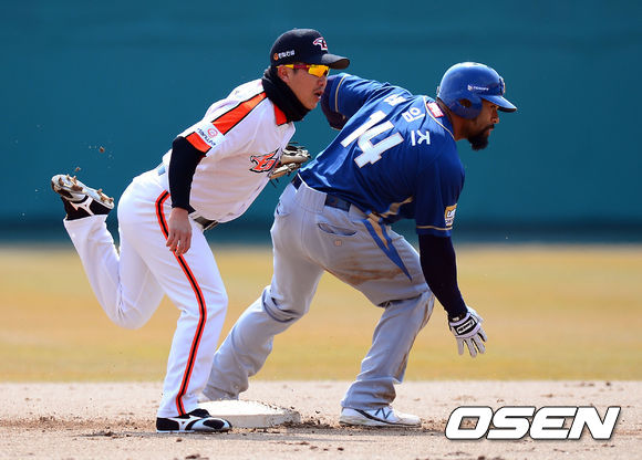 1회초 1사 1루 NC 이호준 타석때 1루주자 테임즈가 폭투를 틈타 2루 도루를 시도하다 아웃당하고 있다.