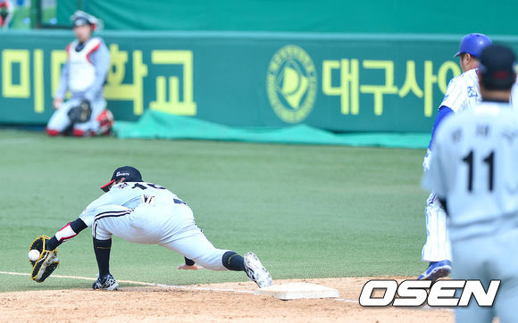1회말 삼성 공격 2사 2루 상황 최형우의 내야 땅볼 때 LG 1루수 정성훈이 유격수 권용관의 송구를 놓치고 있다. 유격수 송구 실책으로 기록되며 2루 주자는 득점에 성공.