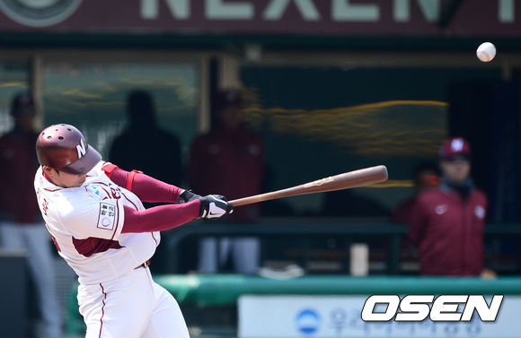 1회말 1사 1루에서 넥센 강지광이 중전 안타를 날리고 있다.