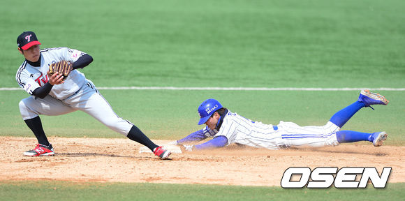 3회말 삼성 공격 무사 1루 상황 주자 정형식이 2루 도루에 성공하고 있다.