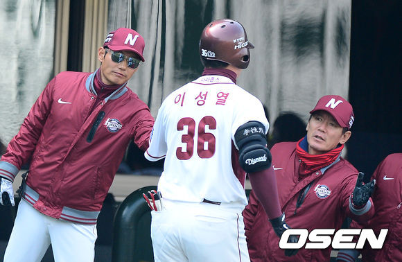 2회말 1사에서 넥센 이성열이 역전 솔로포를 날리고 더그아웃에서 염경엽 감독과 하이파이브를 하고 있다.