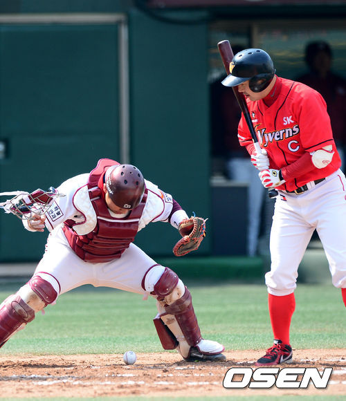 1회초 2사만루 SK 박진만의 타석에 넥센 허도환이 블로킹한 볼을 찾고 있다.