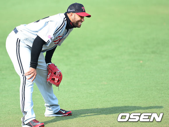 5회말 삼성 공격 선두타자로 나선 나바로의 직선타를 잡아낸 LG 3루수 조쉬 벨이 미소짓고 있다.