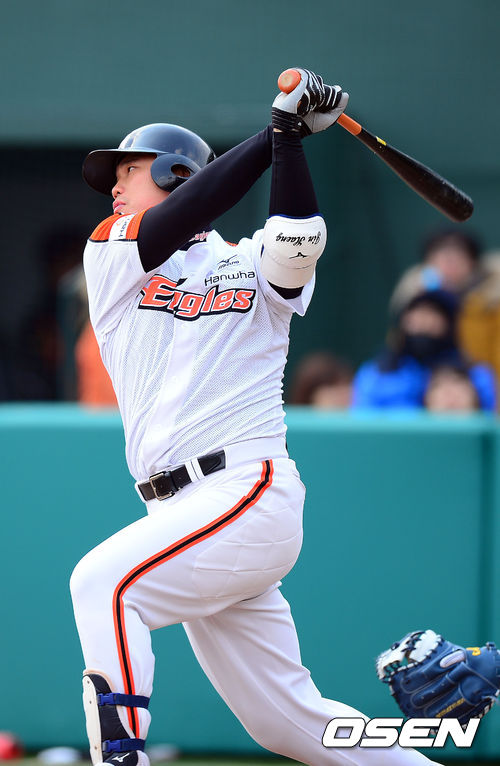 6회말 1사 2루 한화 최진행이 1타점 적시타를 때리고 있다.