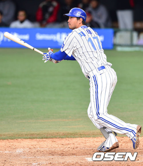 7회말 삼성 공격 1사 1루 상황 채태인이 좌익수 방면 2루타를 날리고 있다.