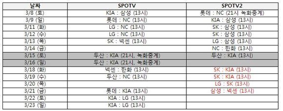 최초로 일본 오키나와와 대만에서 벌어진 프로야구 스프링캠프 연습경기 생중계를 진행했던 IPTV 내의 종합 스포츠 채널인 SPOTV는 SPOTV2와 함께 8일 시작되는 시범경기 생중계를 시작으로 2014년 프로야구 중계방송을 개시한 바 있다.