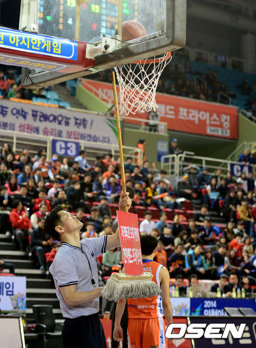 14일 오후 인천 삼산월드체육관에서 열린 '2013-2014 KB국민카드 프로농구' 6강 플레이오프 인천 전자랜드와 부산 KT의 2차전, 1쿼터 KT 오용준의 슛이 림에 끼자 심판이 청소도구를 이용해 볼을 빼내고 있다.