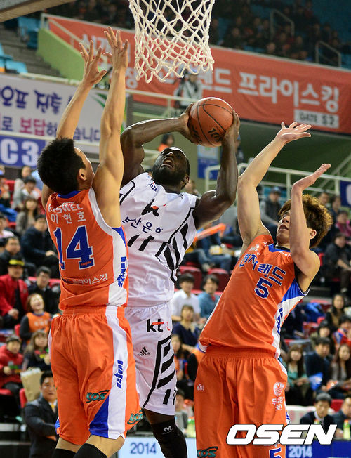 14일 오후 인천 삼산월드체육관에서 열린 '2013-2014 KB국민카드 프로농구' 6강 플레이오프 인천 전자랜드와 부산 KT의 2차전, 1쿼터 KT 파틸로가 전자랜드 이현호, 김상규의 수비를 피해 슛을 시도하고 있다.