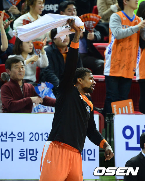 14일 오후 인천 삼산월드체육관에서 열린 '2013-2014 KB국민카드 프로농구' 6강 플레이오프 인천 전자랜드와 부산 KT의 2차전, 2쿼터 전자랜드 포웰이 벤치에서 선수들을 독려하고 있다.