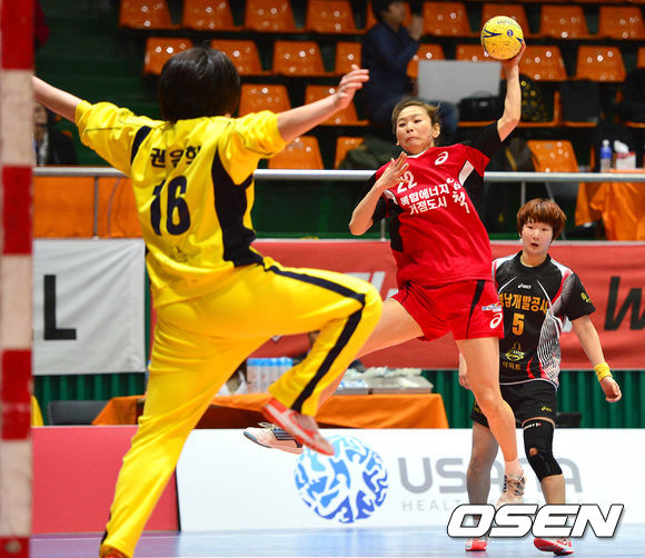 삼척시청 우선희가 경남개발공사 권은희 골키퍼를 피해 슛을 시도하고 있다.