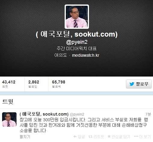 이어 "방송에서 온갖 거짓말과 조작하는 손석희에게는 솜방망이 처분을 내리고, 정확하고 직설적 비판에는 중징계를 내리는 방통심의위가 바뀌지 않으면 우파 논객 설 자리가 없다. 종편도 주춤한다"고 썼다.
