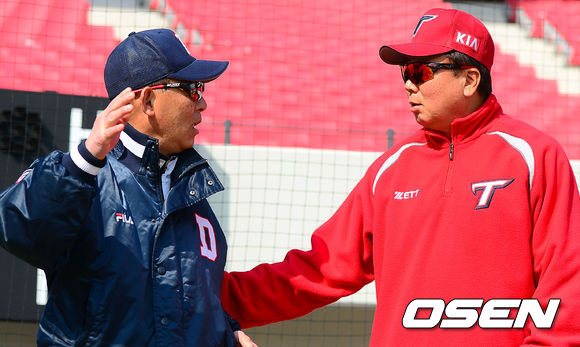 15일 오전 광주-기아 챔피언스 필드에서 열리는 '2014 프로야구' 시범경기 KIA 타이거즈와 두산 베어스의 경기에 앞서 KIA 선동열 감독과 두산 송일수 감독이 인사를 나누고 있다.