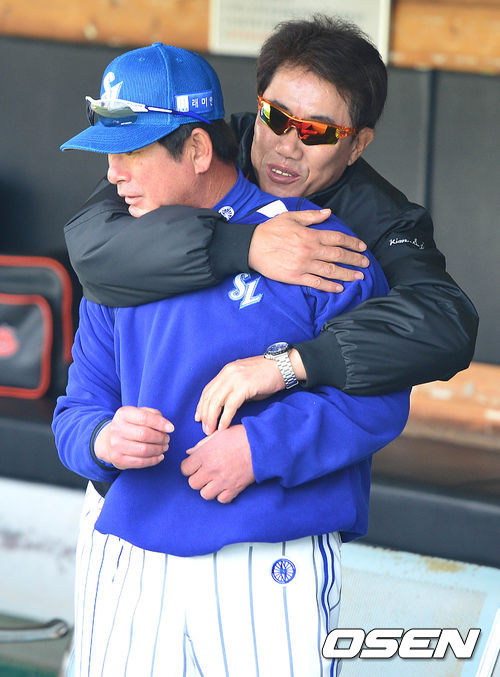 김시진-류중일 감독,'다정다감한 백허그 인사'