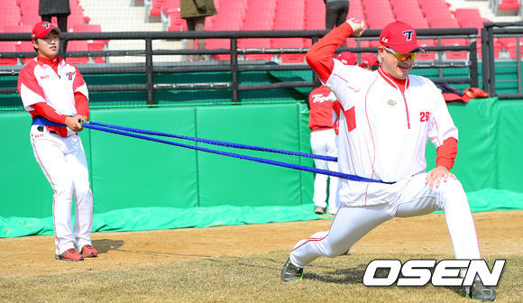 15일 오전 광주-기아 챔피언스 필드에서 열리는 '2014 프로야구' 시범경기 KIA 타이거즈와 두산 베어스의 경기에 앞서 KIA 서재응이 훈련을 하고 있다.