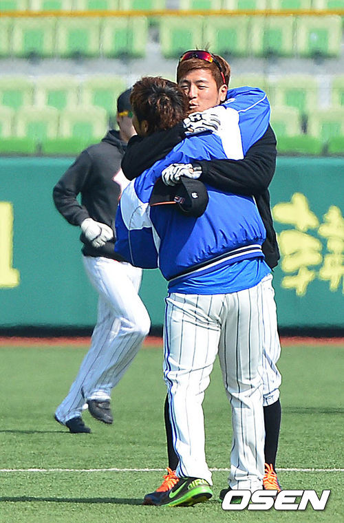15일 오후 대구구장에서 열리는 '2014 프로야구 시범경기' 삼성 라이온즈와 롯데 자이언츠의 경기를 앞두고, 삼성 박석민과 롯데 강민호가 인사를 나누고 있다.