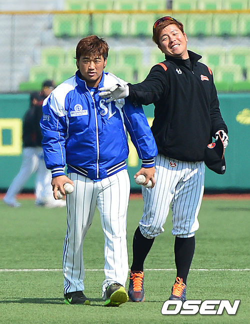 15일 오후 대구구장에서 열리는 '2014 프로야구 시범경기' 삼성 라이온즈와 롯데 자이언츠의 경기를 앞두고, 삼성 박석민과 롯데 강민호가 인사를 나누고 있다.