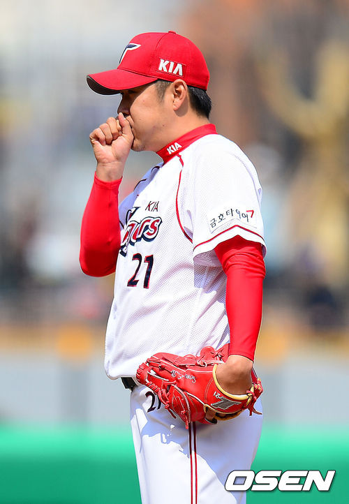 1회초 KIA 송은범이 손에 입김을 불어넣고 있다.