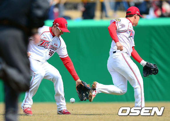 2회초 무사 1루 KIA 안치홍과 필이 두산 홍성흔의 뜬공을 잡으려다 놓치고 있다.