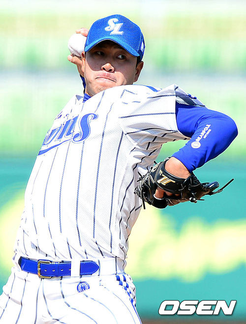 삼성 선발 김희걸이 힘차게 공을 뿌리고 있다.