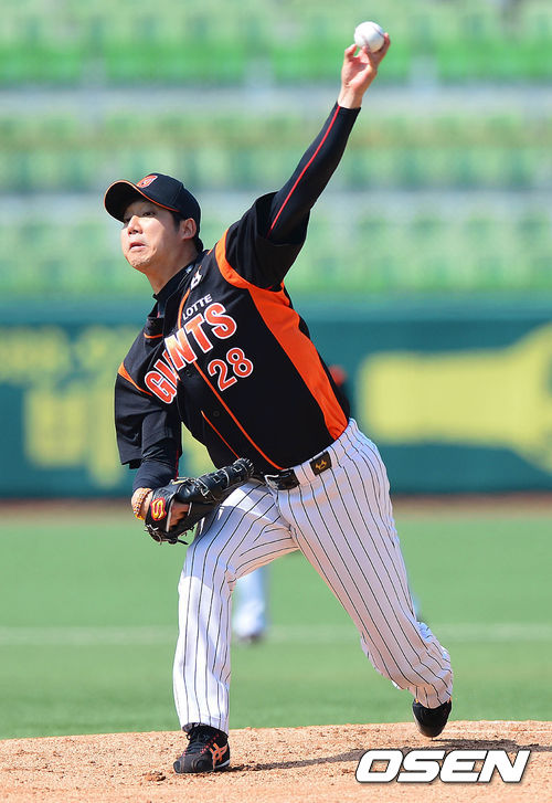 롯데 선발 장원준이 힘차게 공을 뿌리고 있다.
