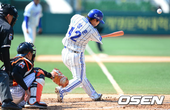 1회말 삼성 공격 2사 2, 3루 상황 이상훈이 2타점 좌전 적시타를 날리고 있다.