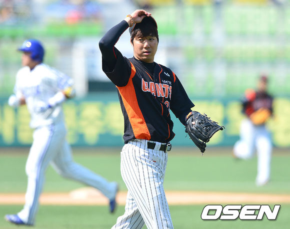 1회말 삼성 공격에서 4실점한 롯데 선발 장원준이 이닝을 마치고 더그아웃으로 들어가고 있다.