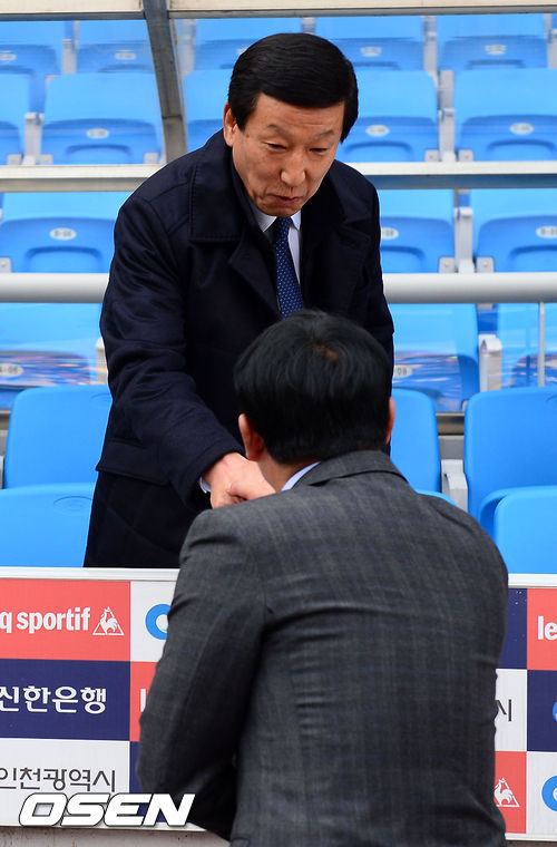 15일 오후 인천광역시 중구 도원동 인천축구전용경기장에서 열린 현대오일뱅크 K리그 클래식 2014 2라운드 인천 유나이티드와 전북 현대 경기, 경기 전 전북 최강희 감독이 인천 김봉길 감독과 악수를 나누고 있다.