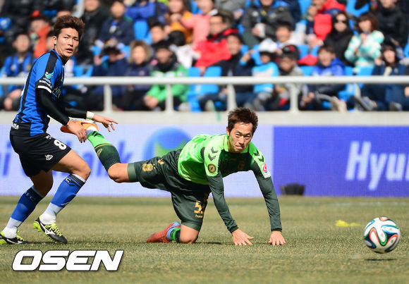 15일 오후 인천광역시 중구 도원동 인천축구전용경기장에서 열린 현대오일뱅크 K리그 클래식 2014 2라운드 인천 유나이티드와 전북 현대 경기서 전반 전북 김남일이 인천 구본상을 돌파하던 중 구본상 다리에 걸려 넘어지고 있다.