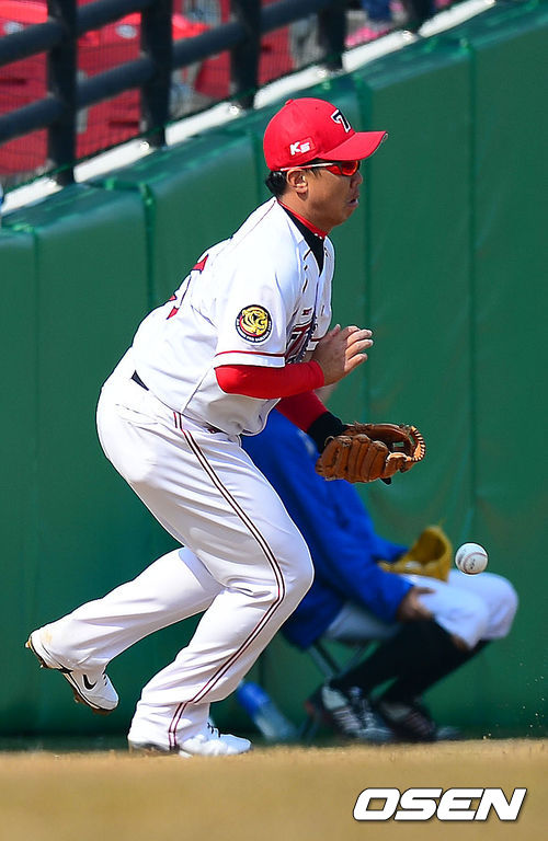 5초 무사 KIA 이범호가 두산 오재일의 파울타구를 놓치고 있다.