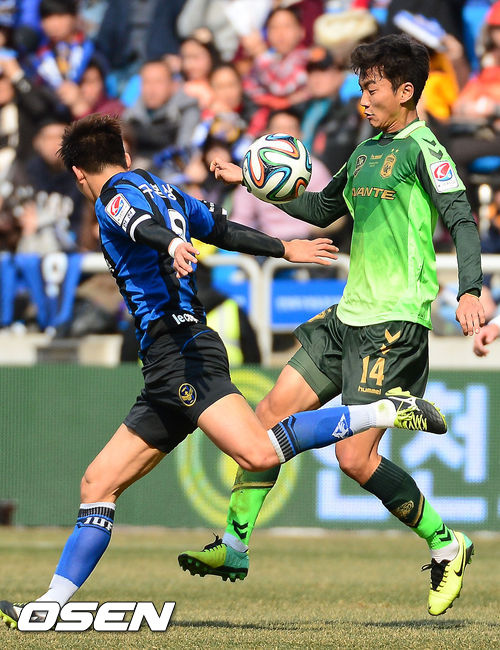15일 오후 인천광역시 중구 도원동 인천축구전용경기장에서 열린 현대오일뱅크 K리그 클래식 2014 2라운드 인천 유나이티드와 전북 현대 경기 전반 전북 이승렬 인천 구본상이 볼다툼을 하고 있다.