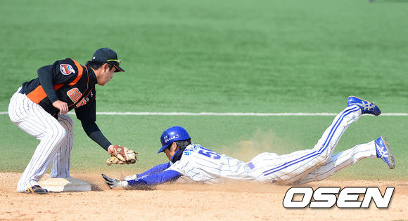 6회말 삼성 공격 1사 1루 상황 대주자 박찬도가 2루 도루에 성공하고 있다.