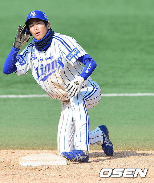6회말 삼성 공격 1사 1루 상황 대주자 박찬도가 2루 도루에 성공한 뒤 숨을 고르고 있다.